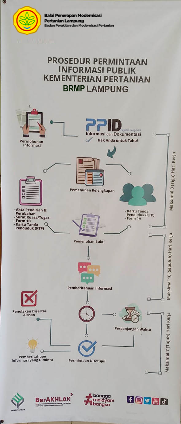 Prosedur Pelayanan Informasi Publik lingkup Balai Penerapan Modernisasi Pertanian Lampung disusun berdasarkan Peraturan Menteri Pertanian Nomor 32/Permentan/OT.140/5/2011 tentang Pengelolaan dan Pelayanan Informasi Publik di Lingkungan Kementerian Pertanian dan Peraturan Komisi Informasi Republik Indonesia Nomor 1 Tahun 2021 tentang Standar Layanan Informasi Publik.