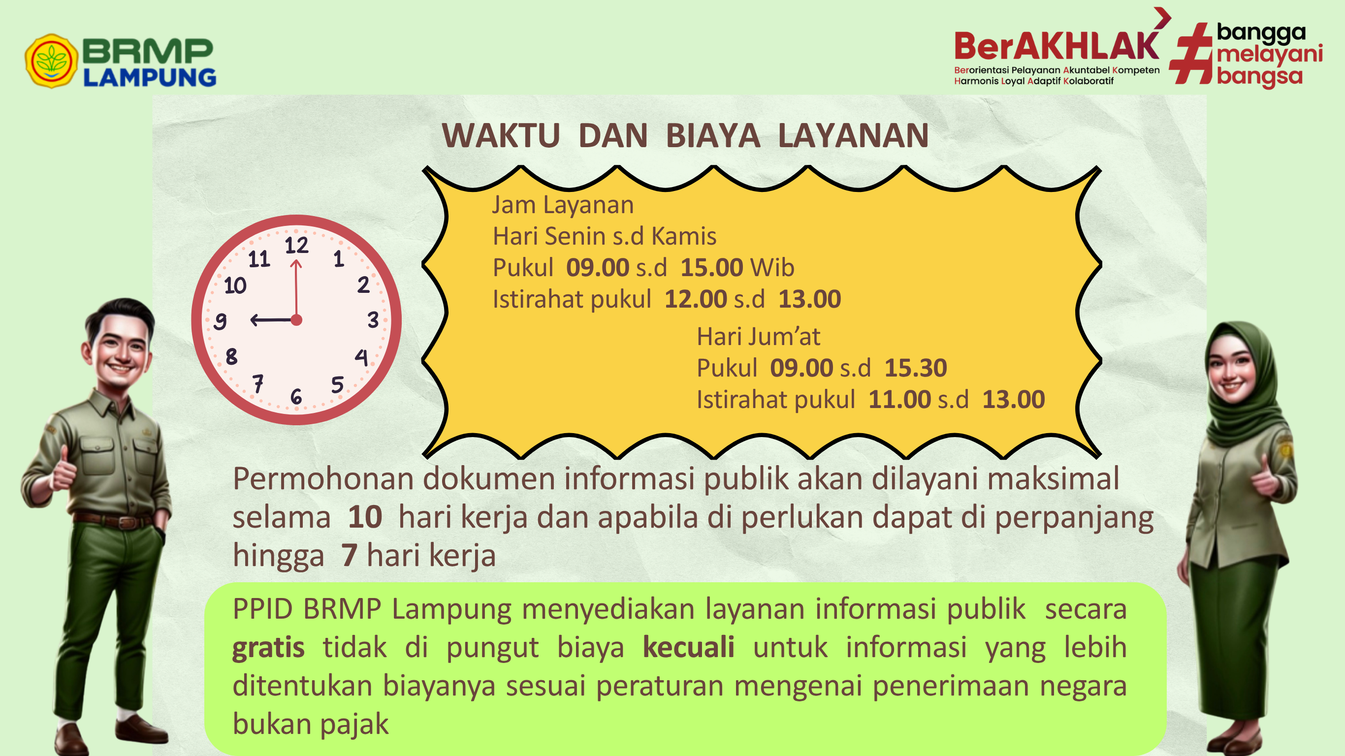 PPID Balai Penerapan Modernisasi Pertanian menyediakan layanan informasi publik secara gratis (tidak dipungut biaya), kecuali untuk informasi yang telah ditentukan biaya Penerimaan Negara Bukan Pajak (PNBP). Sedangkan untuk penggandaan atau perekaman, pengguna layanan informasi publik dapat melakukan penggandaan sendiri di tempat penyediaan jasa fotocopy yang berada di sekitar gedung Kantor BRMP didampingi oleh petugas layanan informasi atau yang bersangkutan menyiapkan media perekam elektronik. Pelayanan informasi publik akan diproses oleh petugas selama maksimal 10 hari kerja, dan dapat ditambah hingga 7 hari kerja apabila diperlukan.